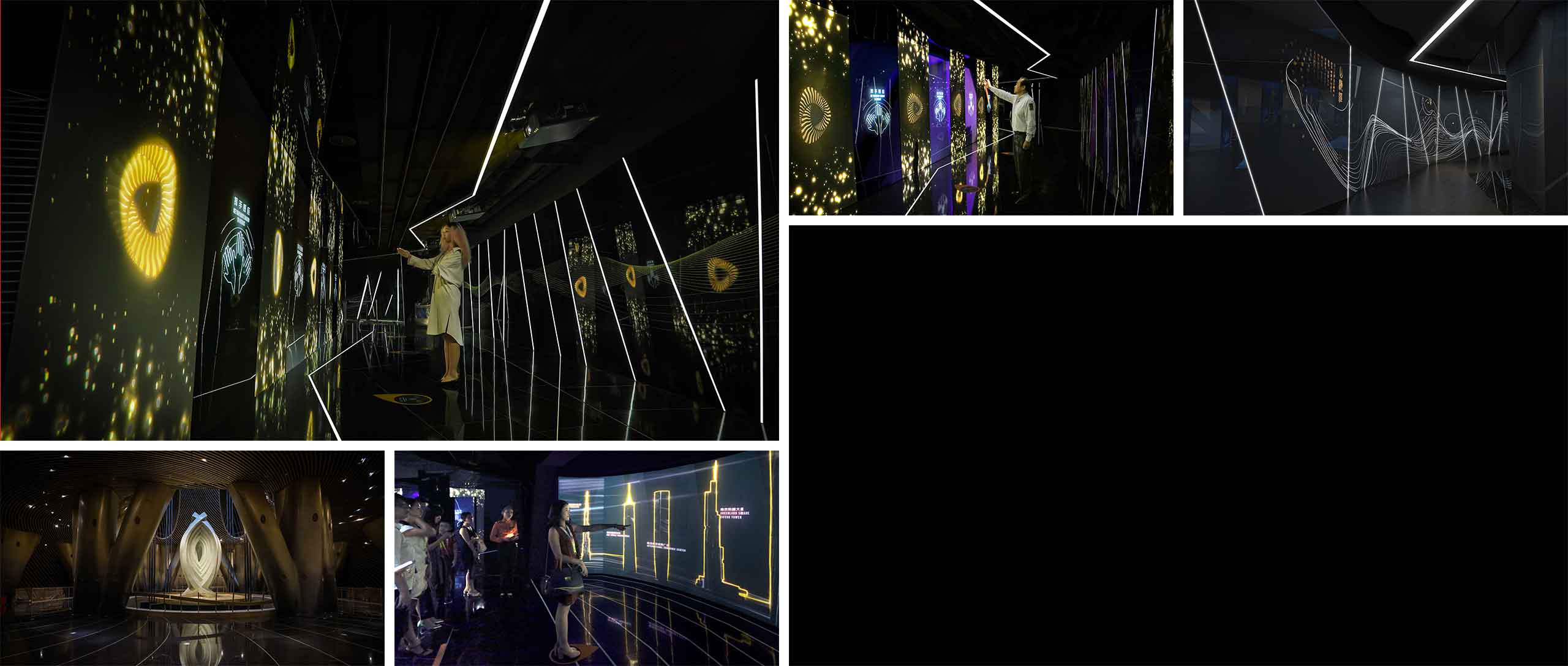 This exhibition space is the most elevated in the world, towering over the skyline of the city on the 125th floor of the Shanghai Center. It is built around a mechanic marvel, the Tuned Mass Damper, which stabilizes the tower in case of extreme winds or earthquakes. Vividly explaining this technology, the visitor is guided to experience animated double layer holovision models, interact with breathing projection walls and large scale magic glass installations. A high-tech adventure in the clouds.