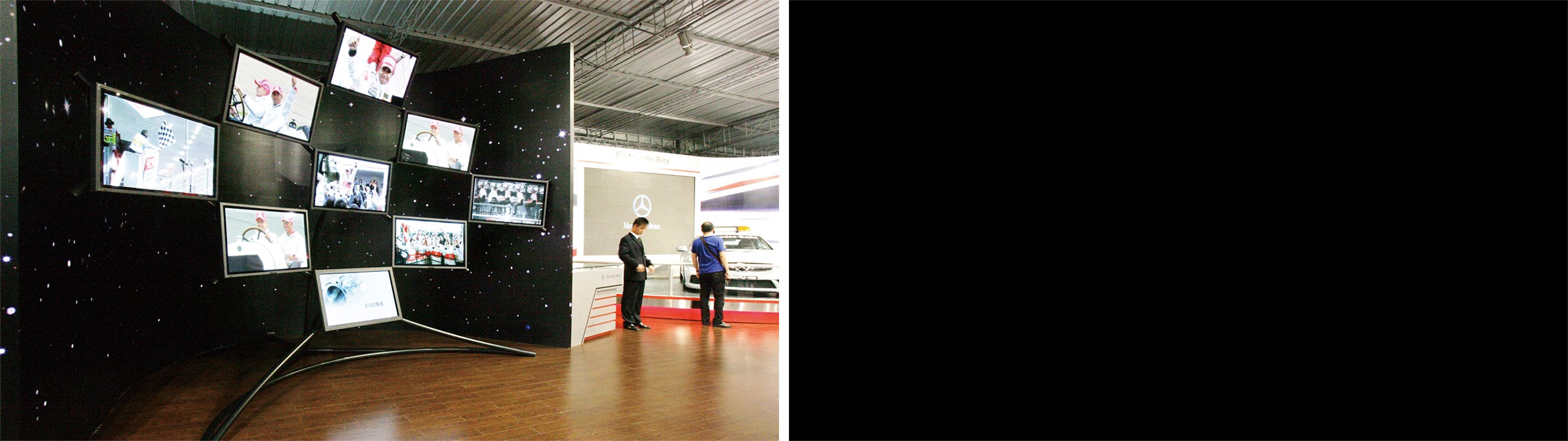 Taking the checkered flag in racing events as a design inspiration, we created an impressive display by stitching together nine large plasma screens. One of them is tactile and allows the audience to choose, drag around and explore films and visuals or play one big visual across all nine screens. Conventional TV format video and advertising content thus becomes in itself a new fascinating interactive performance.