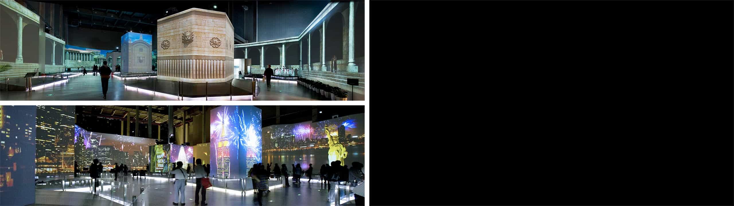 We trace the birth and growth of cities over the past five thousand years in both the East and the West, from ancient times till now. First we established several geometric shapes which are common to all those very different urban architectures, thus building a three-dimensional "city framework". Now, with the help of multimedia technology, this city comes to life. As the audience wonders through this virtual city, the architecture, the inhabitants, their rites and culture are constantly changing. The audience is traveling through time and space and experiences how people of all cultures have strived to imagine and build the “ideal city”.