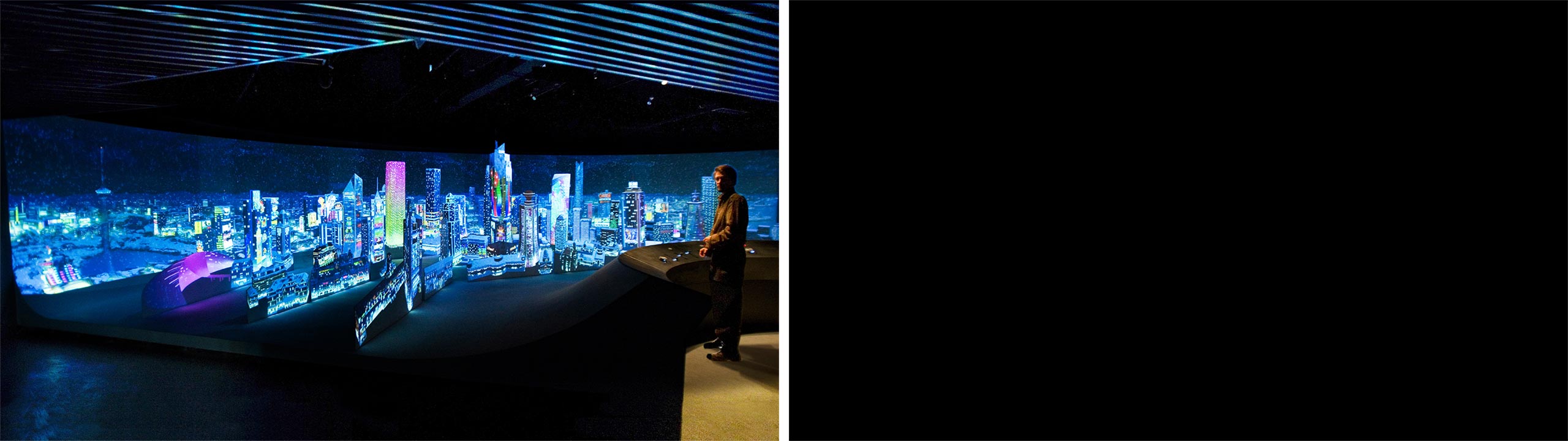 Here in the last hall of a vast museum we decided to give the audience a chance to let their imagination run wild. We rebuilt the skyline of the city of Tianjin by putting up layers and layers of projected panels, which when viewed from the central control desk recreate a realistic and volumetric cityscape. The audience - much like a DJ - can operate the table's controls and completely change any aspect of the city in realtime, learning and playing at the same time.
