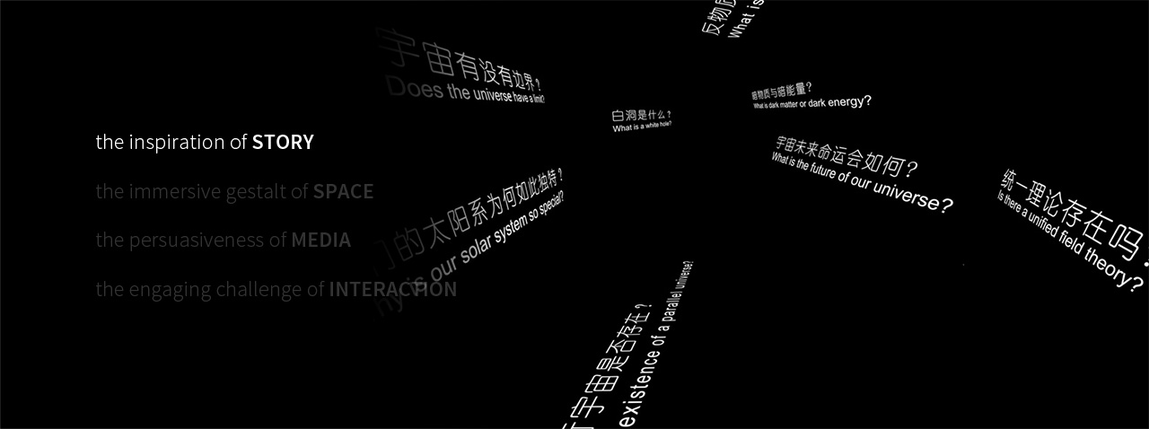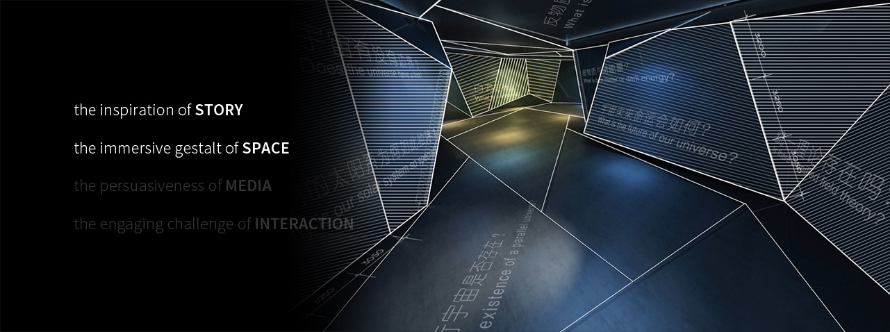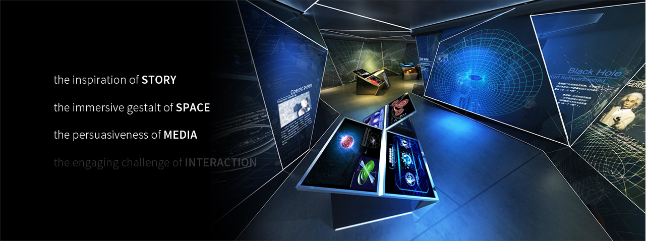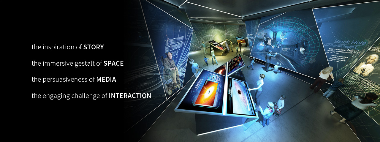 Exhibitions have the potential to be a total experience that stimulates all our senses: The immersive gestalt of SPACE, the persuasiveness of MEDIA in all its forms, the engaging challenge of INTERACTION and, last but not least, the inspiration of STORY. Only by combining those four aspects — STORY, SPACE, MEDIA and INTERACTION — into one synergetic whole, will we create what we call NEW MEDIA SPACE!